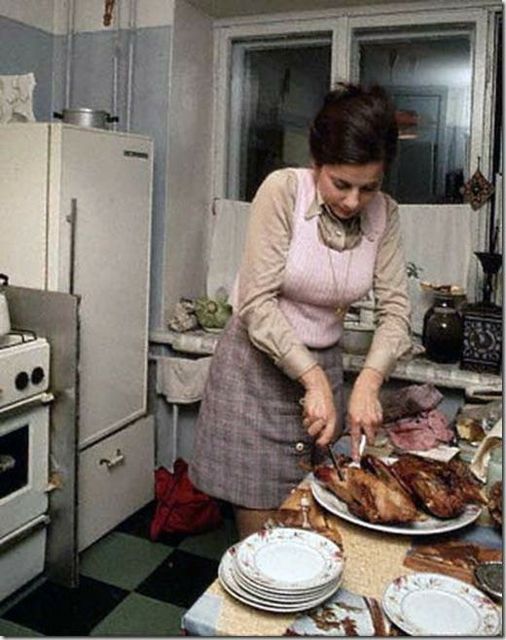 Не иначе подготовка к Новому Году в хрущёвке!? Посуда из серванта, банки с домашним компотом на подоконнике, занавесочки в половину окна, стены крашенные серенькой масляной краской, две запечённые в духовке курицы занимающие половину кухни, за которыми отстояно в очереди по три часа на морозе. И молодая вкусная хозяюшка в короткой клетчатой юбочке. Вот по ней бы я и понастальгировал. А по чему ещё больше...?