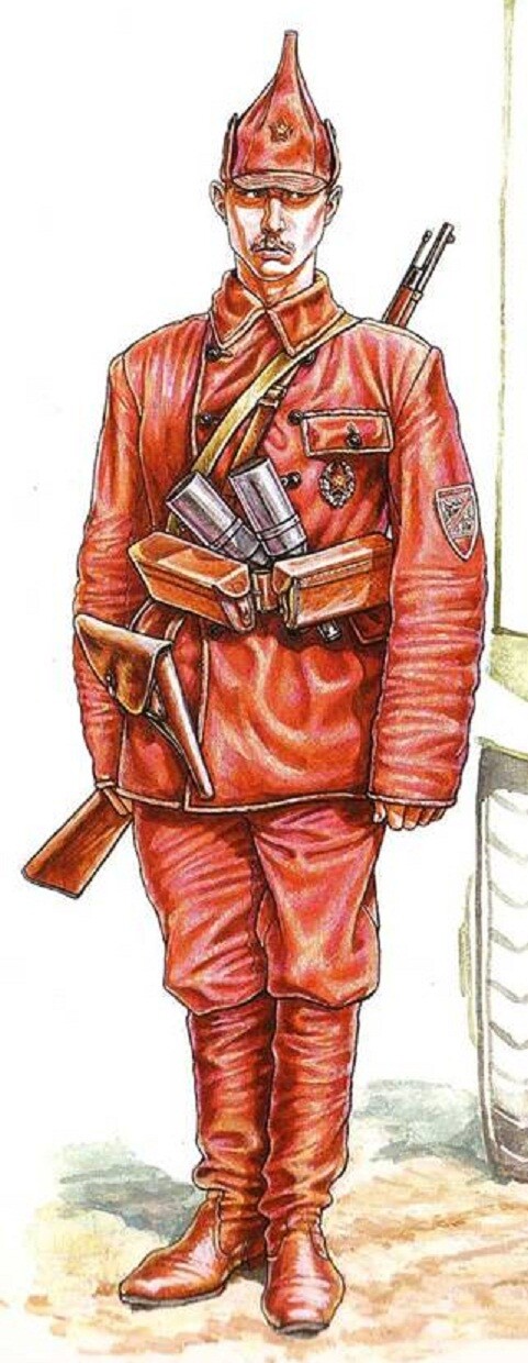Нельзя сказать чтобы дорвавшиеся до власти крестьяне и рабочие и производные от них солдаты и матросы отличались скромностью, о бархатных портянках мечтали все. И действительно, в первых образцах формы для РККА использовался натуральный шёлк и бархат, аксельбанты с серебряными нитями и золотое шитьё! Пролетарская армия должна была поражать своих врагов на поле боя не только своей мощью, но и своим великолепием! К сожалению этого не случилось. Модельеры сделали несколько образцов формы. Например полностью кожаный комплект обмундирования (от буденовки до трусов) из кожи красного цвета, для гвардейского бронепоезда. Или форму Генштаба из алого сукна. Но к несчастью для армии, награбленного в купеческих лабазах материала катастрофически не хватало. Поэтому и пришлось довольствоваться старыми запасами ещё царского обмундирования. А небольшое количество экспериментального красного обмундирования, скомунизженного из швейных мастерских ещё долго гуляло среди комсостава удивляя своим ярким цветом прохожих.