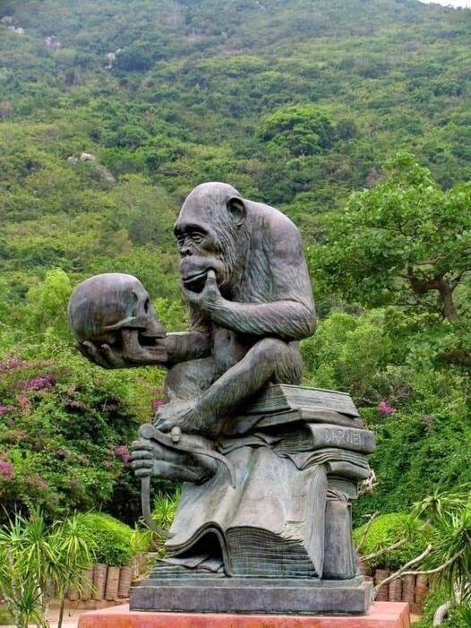 Что там и греха таить, бывает что возомнив себя слишком умными называют европейцы жителей людей непонятных им культур "обезьянами". И вряд ли поймут жители Европы, что во многих странах это и оскорблением не является. Есть например индийский бог обезьян Хануман, который представляется в эпосе Рамаяна мудрым и отважным правителем своего народа. Или китайское божество с внешностью обезьяны Сунь Укун. Занимающий в пантеоне буддийских божеств далеко не последнее место. Насмотрелись мудрые китайцы и индусы на людей, уничтожающих всё вокруг себя - природу, животных и собственных соплеменников и решили, нет, человек не самое мудрое животное из созданных богами. Сколько пало империй, сколько человеческих существ сеют в мире смерть и разрушение вместо созидания и приумножения знаний? Вот и поставили китайцы такую скульптуру мудрой обезьяны на фоне волшебной природы, сидящей на трудах Дарвина. Думай человек. А то может надоест природе посылать тебе чёрные метки в виде оспы, спида и COVIDA...? Может и шанса больше не будет?