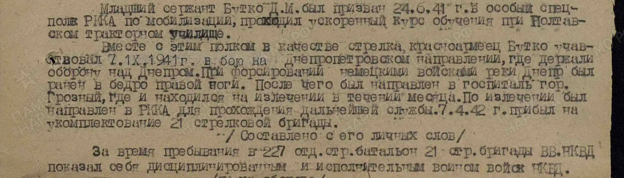 «Младший сержант Бутко Д.М. был призван 24.6.41 в особый спецполк РККА по мобилизации, проходил ускоренный курс обучения при Полтавском тракторном училище.