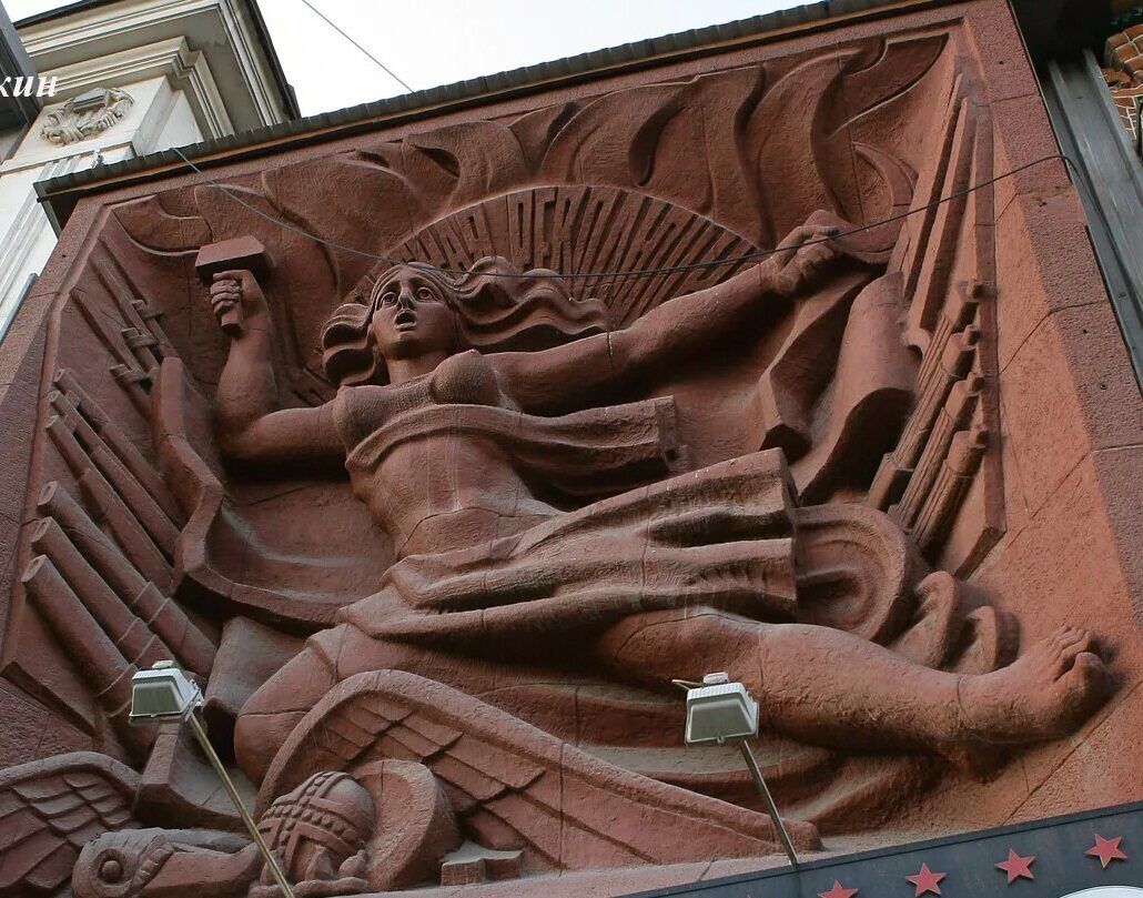 Советское искусство зачастую было бесполым. Все эти трактористки и колхозницы в одинаковых платьях ниже колен со снопами и бидонами в руках. Но вот что касается красноярского кинотеатра Октябрь, то там хоть тётка и держала в руках кувалду, но фигуру имела очень женскую! Особенно в верхней части тела. Вот и стояли пацаны перед сеансом восхищённо задрав головы и придерживая кепки на стриженых макушках. И в марте и в июле сбегали в Октябрь...!!