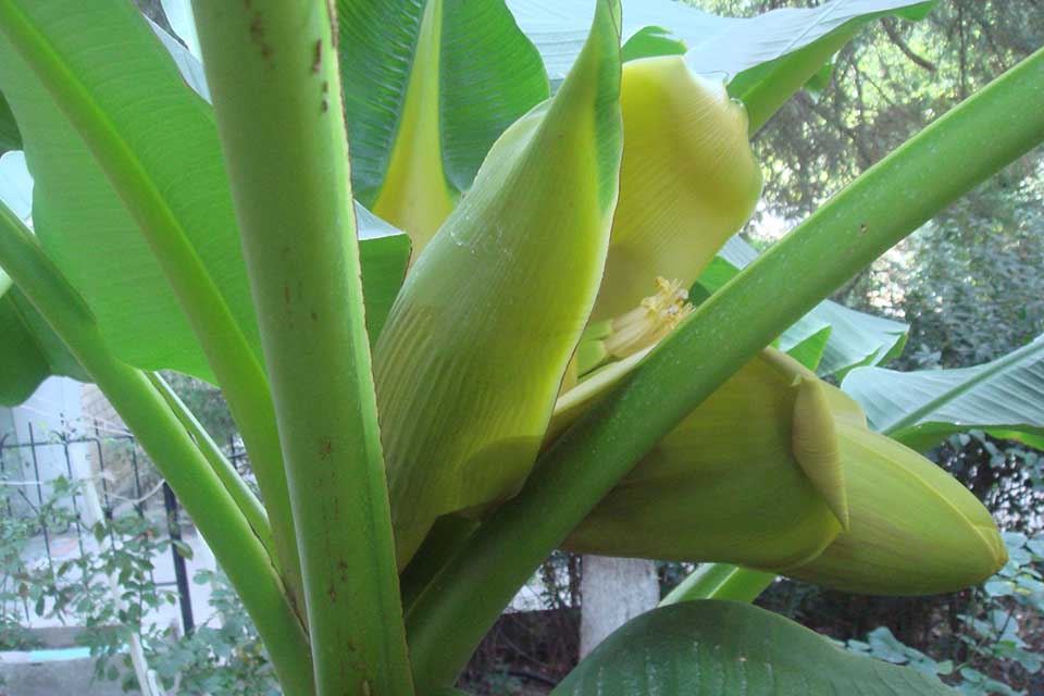 А в моем садочке на Ц-1 (1-этаж) бананы так хорошо росли-множились, просто загляденье... Каждый вечер я эти шикарные крупные листья обмывала водой, причем старалась струю направить сверху вниз и в самую середину и на это мое радостное действо 2 года подряд моя бананиха одаривала меня 2-мя кистями бананчиков карликового сорта. Я наблюдала, как появлялась груша на длинной ножке, потом она постепенно открывалась и оттуда высовывались маленькие пальчики - так я их называла, как из перчатки обрезанной. Все прохожие диву давались и просились зайти в садик, чтоб полюбоваться этим чудом в центре Ташкента. Бананчики уже хорошо подростали и так случалась оба года подряд, что в октябре вдруг откуда ни возьмись налетал мороз и утром я видела некрасивую картину после его действия. Листья пальмы упали вниз прикрыв ствол, и мои дорогие пальчики за которыми я приглядывала до глубокого вечера обычно, замерзали. Пальмы после мороза уже не восстанавливались и их надлежало срубить и укутать. Вот одно из фото.