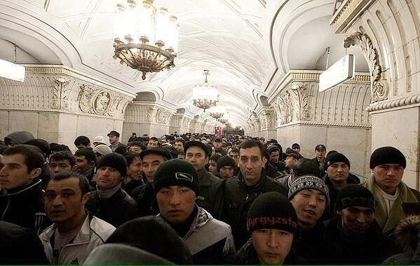 Утро в московском метро! Считаю это в высшей мере справедливым! Город должен принадлежать тем, кто создаёт для него социальные блага! Кто подметает в этом городе дворы. Тем, кто моет полы в подъездах вашего города. Кто работает на стройках этого города. Кто снабжает этот город мясом, фруктами и овощами. Кто эти овощи и фрукты продаёт вам на рынках. Тем, кто водит маршрутки и такси в вашем городе. Тем, кто платит непомерную арендную плату за квартиры в вашем городе. Они не требуют вашего, они медленно, но неотступно забирают своё!