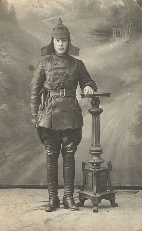 Старые фото. 1919 год. Офицерская портупея снятая с убитого поручика, лётная куртка реквизированная на разграбленном складе, кавалеристские сапоги с расстрелянного казака, модная пехотная будёновка, и идеи Ленина и Троцкого в голове. Ничего своего, всё ворованное и экспроприированное. Идеальный чекист...
