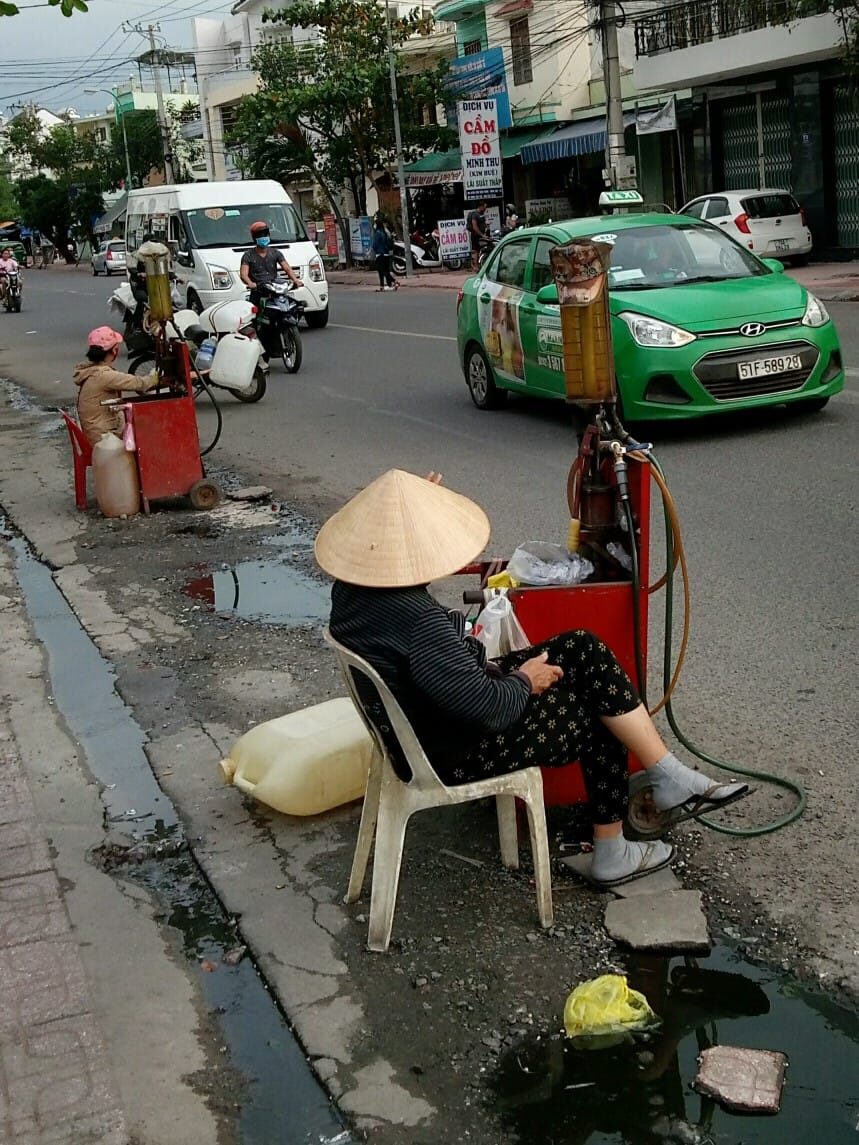 В Китае, Вьетнаме и Камбодже очень много мотоциклов и мокиков с малым объёмом двигателя. Ехать на окраину города, на большую заправку очень затратно и занимает много времени. Поэтому вдоль улиц сидят такие импровизированные заправщики с минизаправками, всегда готовые продать мотоциклисту и моторикше поллитра-литр недорогого горючего...