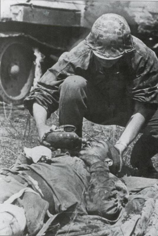 Старые фото. Начало июля 1943 года. Солдат Ваффен СС подошел к советским солдатам, один из которых смертельно ранен. Раненому оказана первая помощь, у него повреждены руки и ноги. Солдат СС наклоняется над смертельно раненым и дает ему воды из своей фляги.
