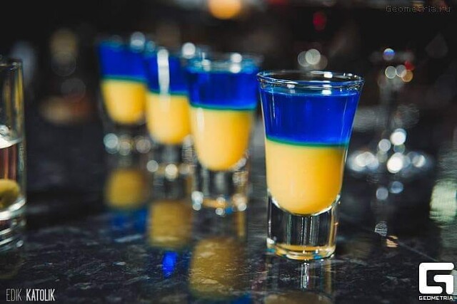 Коктейль Слава Украине! Низ тыквенно-дынный сок (в Канаде тыквенно-кленовый), верх горилка и ликер Блю Кюросао.