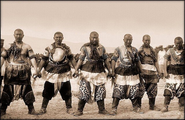 Старые фото. 1909 год. Соревнования по традиционной монгольской борьбе. Интересна верхняя часть костюма для борьбы. У борцов всегда оголена грудь. Так случилось, что однажды в турнире по борьбе победила женщина, обладающая необыкновенной силой и ловкостью. Чтобы участвовать в турнире ей пришлось переодеться мужчиной. Обман раскрылся не сразу, она как и положено получила свой законный приз - табун лошадей и меру серебра. После того как несколько свидетелей показали что она женщина, призы у неё отбирать не стали, но с тех пор все борцы выходили на поле с открытой грудью. Судьи должны были убедиться что перед ними мужчины...