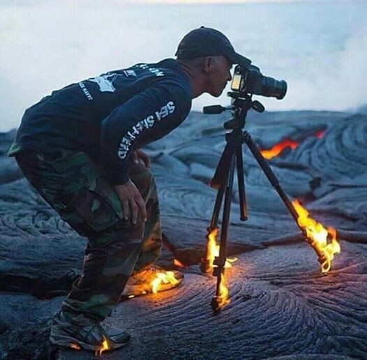 Учёный вулканолог снимает жерло вулкана, стоя на неостывшей лаве с температурой выше ста градусов...