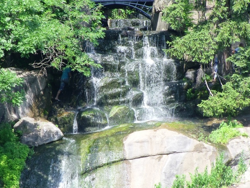 С мостика можно любоваться потоками воды, которые уступами канала при открытом шлюзе устремляются к отвесным скалам и Большим водопадам низвергаются в Нижний пруд.