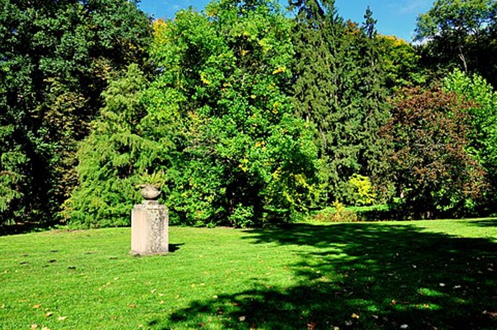Вглубь Елисейских полей, с левой стороны на зелёном лугу на гранитном пьедестале стоит гранитная ваза.