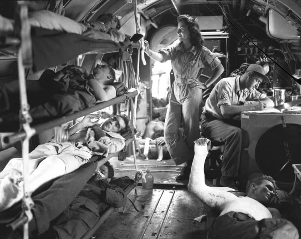 Старые фото. 1944 год. Американские медсестра и врач эвакуируют раненых из Манилы на борту транспортного самолёта С-46. Медперсонал перед отправкой на фронт проходил психологический инструктаж. Было замечено, что раненные солдаты более сдержаны в отрицательных эмоциях, реже впадают в депрессию и быстрее выздоравливают, если видят рядом с собой приветливую и улыбающуюся женщину....