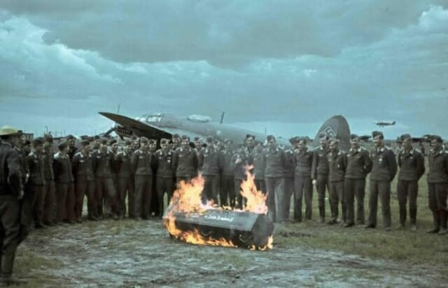 Старые фото. 1942 год. Украина, Харьков. Экипажи самолётов Хенкель-111 окружили горящий гроб. Странная фотография, правда? Вроде никогда у немцев не существовало традиции сжигать покойников. Но это не то что вы подумали. Это ритуал для лётчиков только что прибывших на фронт. В этом гробу они сжигают свои страхи. Страх больше не увидеть родных, страх что кончатся патроны, страх пойти на таран, страх быть убитым...