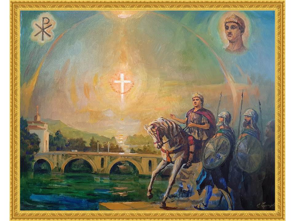 В 312 году у Константина было мало шансов стать императором, его мать была дочерью хозяина корчмы. Он совершил ошибку, повёл свои легионы на Рим. Но увидел крест поверх солнца, это природное явление называется ложное солнце. Паргелий (от др.-греч. «солнце» — ложное солнце) или солнце с ушами — один из видов гало, выглядит как светлое радужное пятно на уровне Солнца. Возникает вследствие преломления солнечного света в анизотропно ориентированных кристалликах льда, парящих в атмосфере. Приказал своим воинам нарисовать на щитах крест. Император Максенций сделал большую ошибку, он вывел свои легионы из Рима в битве у Мульвийского моста, его сбросили в Тибр и он погиб. Святой равноапостольный император Константин в 325 году сделал христианство господствующей религией, в 330 году перенёс столицу государства в Византий, в дальнейшем переименованный им в свою честь (Константинополь), организовал новое государственное устройство.
