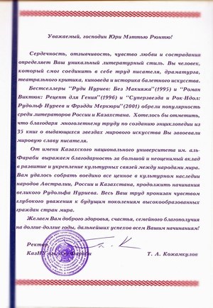 « Уважаемый, господин ЮРИ МЭТТЬЮ РЮНТЮ!