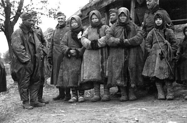 Старые фото. Осень 1942 года. Передовой отряд немецких мотоциклистов в российской деревне, оставленной отступающими советскими войсками. Женщины растеряны и явно не понимают как себя вести...