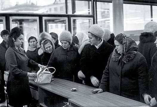 Старые фото. 1979 год. Нет, такая буржуйская сумочка нам не нужна. Белая, очень маркая. Да и не влезет в такую ни качан капусты, ни десяток кусков хозяйственного мыла, ни килограмм картошки... Авоську дайте...