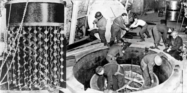 Старые фото. 945 год. На снимке цилиндрический котел нацистского экспериментального ядерного реактора B-VIII с поднятыми из него гирляндами из урановых кубиков. Дедушка всех ядерных ракет и бомб! Этот реактор был собран немецкими учеными под руководством Вернера Гейзенберга в городе Хайгерлох, а в апреле 1945 г. тайно вывезен агентами американских спецслужб из разгромленного рейха в Штаты, где был собран заново. На снимке рядом американцы (бойцы Бориса Паша) демонтируют реактор сразу же после его обнаружения. Тяжелая вода и урановое топливо в реакторе отсутствовали. Урановые слитки общим весом 1,5 тонны и три бочки с тяжелой водой были закопаны немцами в поле, затем найдены американцами и вывезены в США.