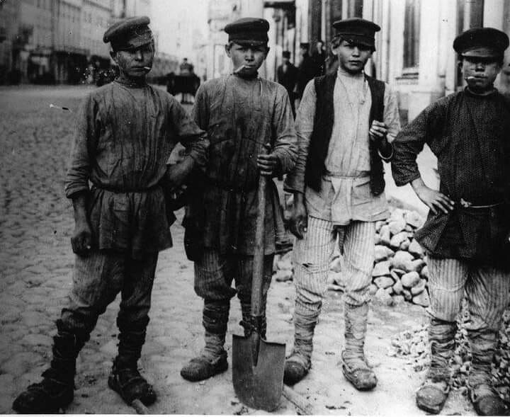 Старые фото. Между 1910 и 1916 годами. Москва. У Собянина даже ещё отец не родился, а дорожное строительство в Москве продолжает свой нескончаемый процесс. Москва существует пока в ней идёт строительство дорог. Как только закончится строительство, закончится и Москва. Подростки из провинции понаехали в "нерезиновую" чтобы схватить птицу счастья за хвост. Нужно придать себе солидности, (как-же из крестьян в пролетарии) поэтому все курят! Да и пьют наверное тоже ...
