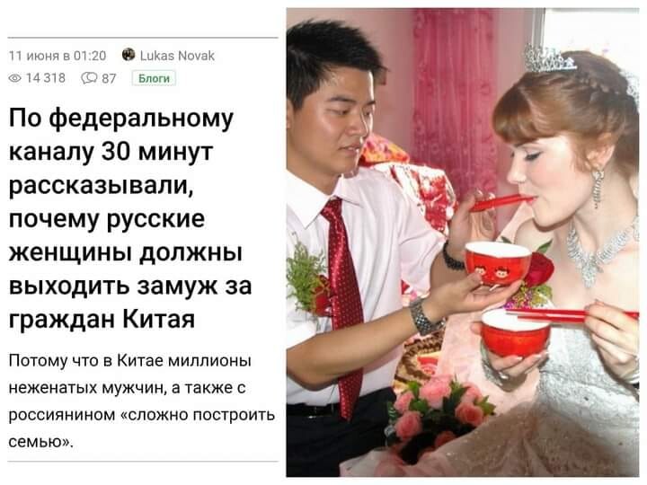 Среди всех независимых стран оставшихся после развала "колосса на глиняных ногах" который именовали СССР, в России самая маленькая рождаемость и самое большое число разводов на душу населения. Греет в этом плане только статистика Кавказа, у них с этим всё в порядке. Поэтому россияне должны быть благодарны китайцам! Их специалисты находят эти алмазы валяющиеся в грязи, и гранят из них настоящие бриллианты. По китайски неторопливо, и не привлекая лишнего шума они раскапывают эту золотую для себя жилу, и превращают тоненькую струйку ручейка в широкий и бурный поток....
