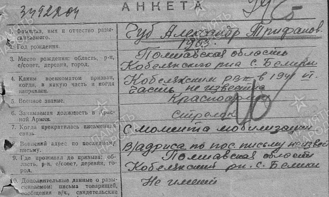 Комсомолец, призванный Полтавским РВК, пропал без вести в июле 41-го.