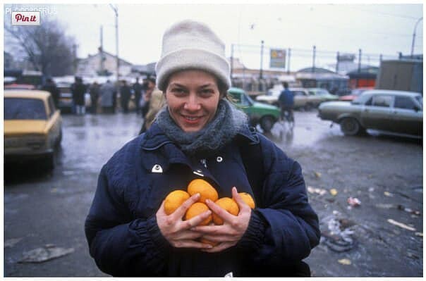 Старые фото. 21 декабря 1994 года. Американская журналистка Синтия Эльбаум (Cynthia Elbaum) с мандаринами, которые она купила на грозненском рынке. На следующий день, 22 декабря, она погибла при бомбардировке российской авиацией нескольких объектов в Грозном. Через некоторое время выступил Ельцин и сказал, что "на город Грозный не упала ни одна бомба"....