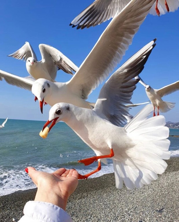В это время, обычно грустное выражение лица женщины, словно оживало и озарялось счастливой улыбкой. Иногда женщина клала кусочек хлеба на ладонь и вытягивала руку перед собой. Одна из чайка, пролетая рядом, хватала клювом кусочек прямо с ладони, что вызывало у женщины дополнительную радость. Затем женщина стряхивала хлебные крошки с салфетки под ноги, где уже с нетерпением, толкая друг друга, ворковали голуби. С радостной улыбкой она возвращалась на лавочку. Мужчина с нескрываемой любовью наблюдал за женщиной, невооруженным глазом было видно, что это тоже доставляло ему огромное удовольствие.