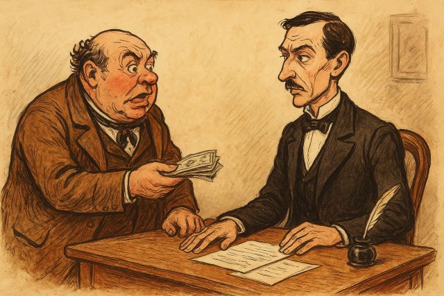 Городничий достает из внутреннего кармана ассигнации и дрожа кладет на стол. Ревизор садится и начинает их пересчитывать.