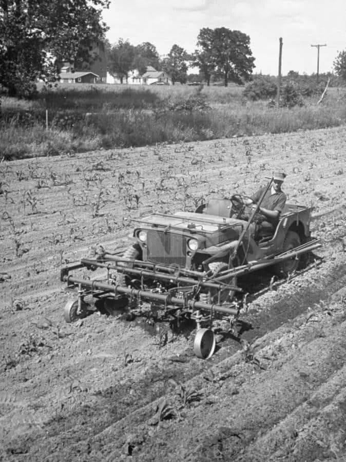 Фермер использует армейский джип Willys-Overland как культиватор для демонстрации послевоенного использования военной техники.