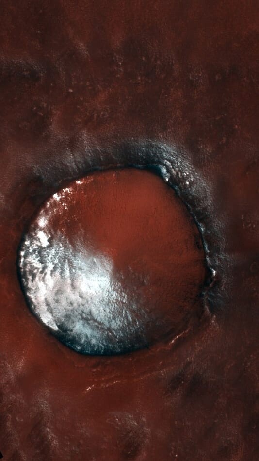 Европейское космическое агентство (ЕКА) показало снимок, сделанный орбитальным аппаратом Trace Gas Orbiter (TGO). На нем видно кратер шириной 4 км, который находится в районе Великой Северной равнины на Марсе.