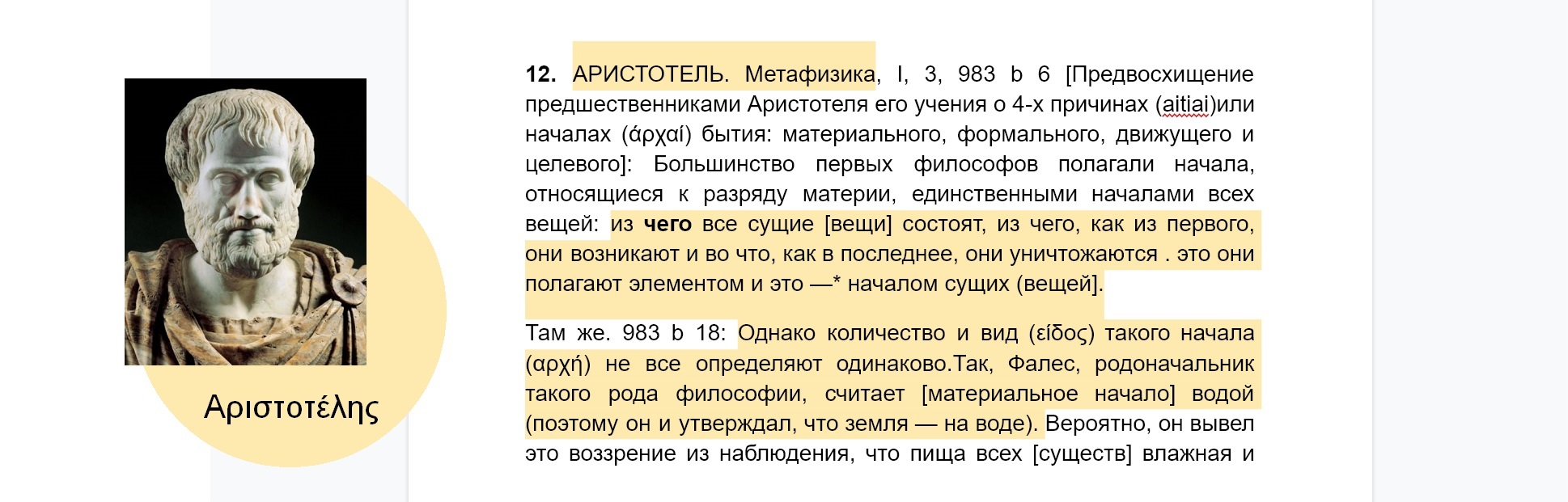 12. АРИСТОТЕЛЬ. Метафизика, I, 3, 983 b 6 [Предвосхищение предшественниками Аристотеля его учения о 4-х причинах (aitiai)или началах (;;;;;) бытия: материального, формального, движущего и целевого]: Большинство первых философов полагали начала, относящиеся к разряду материи, единственными началами всех вещей: из чего все сущие [вещи] состоят, из чего, как из первого, они возникают и во что, как в последнее, они уничтожаются . это они полагают элементом и это —* началом сущих (вещей].