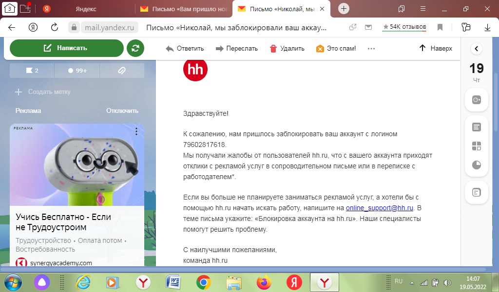 Мы получали жалобы от пользователей hh.ru, что с вашего аккаунта приходят отклики с рекламой услуг в сопроводительном письме или в переписке с работодателем*.