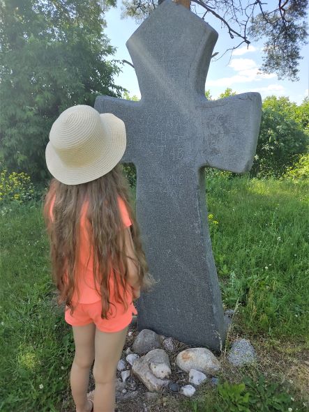 ...Съездил, очень понравилось! Спешу поделиться и рекомендую, у кого есть возможность, посетите и отдохните душой на природе. Не ожидал, если честно, там было интересно и детям и пожилым людям - там настоящая деревня Х века с примерами строений изб, с кузней, пекарней, амбарами и настоящими принадлежностями для бабы Яги - ступой, а Колобку - сусеками. Замечу и то, что строения отличаются особой экологичностью и качеством жилища, предки были далеко не дураки... Но продолжу по делу - изучению имени и надписи на кресте. Копию креста осмотрел со всех сторон - установлен за деревенским круглым тыном (забором, плетнём) на правом берегу реки Мста. Не могу писать о том, чего не видел, не щупал, не дышал этим воздухом... Высеченный на камне текст, по мнению академика РАН, лингвиста А. А. Зализняка, «... напоминает надписи на скандинавских рунических камнях, поставленных в память погибших родственников», т. е. является памятным. На сколь я знаком с творчеством академика, таки скажу без обиняков и прямо - легче во Мсте утопиться с головоломки, чем внять умозаключениям Зализняков и Лихачёвых с Рыбаковыми вкупе (три столпа советской науки - филологи и археолог, не историки совсем - орденоносцы), тут ведь вот какое дело... Кто помер то, ребята? Никто не помер. Язычники? Бог? Лазарь или речь? И кому, по мнению академика - Бог - был погибшим родственником? Если на камне первое слово Бог читается совершенно внятно даже для третьеклассницы. А место на камне над ним белесое - зацелованное от приложения губ паломниками.