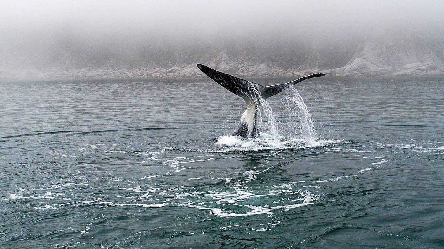 Народу загрузилось под завязку. Потихоньку пошли. Тут не до лихости, да и корабль не тот. И вот когда мы оказались примерно на середине пролива, откуда ни возьмись, появляется громадный кит и начинает с нами играть. Кружит вокруг, подныривает. Резвится. Его размеры втрое превышают габариты нашей жестянки.