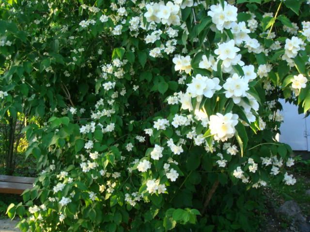 Этот прекрасный старый жасмин когда-то недалёкие люди пытались казнить, спиливали его бензопилой. Но он выжил, поднялся над несчастными пеньками высоко в небеса и там раскинулся вдоволь.