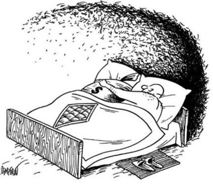 Государственные Держиморды, хапают именно иудины гроши, так как, предавая интересы народа, похерив заботу о его благополучии и процветании Родины, они тащат их ненасытно и всегда из мошны народа. Нет никакого сомнения в том, что коррупция, казнокрадство, мздоимство, клановость и кумовство являются категориями открытого предательства Родины. Ведь только обкрадывая ее и народ возможно набивать свою мошну. Без нее им жизнь не в радость, а тягость, и поэтому-то они, образно выражаясь, даже спать ложатся лишь в обнимку с мошной. Иначе их затерзает бессонница. Именно так это отразил в карикатуре «Любовь» художник А. Димитров.