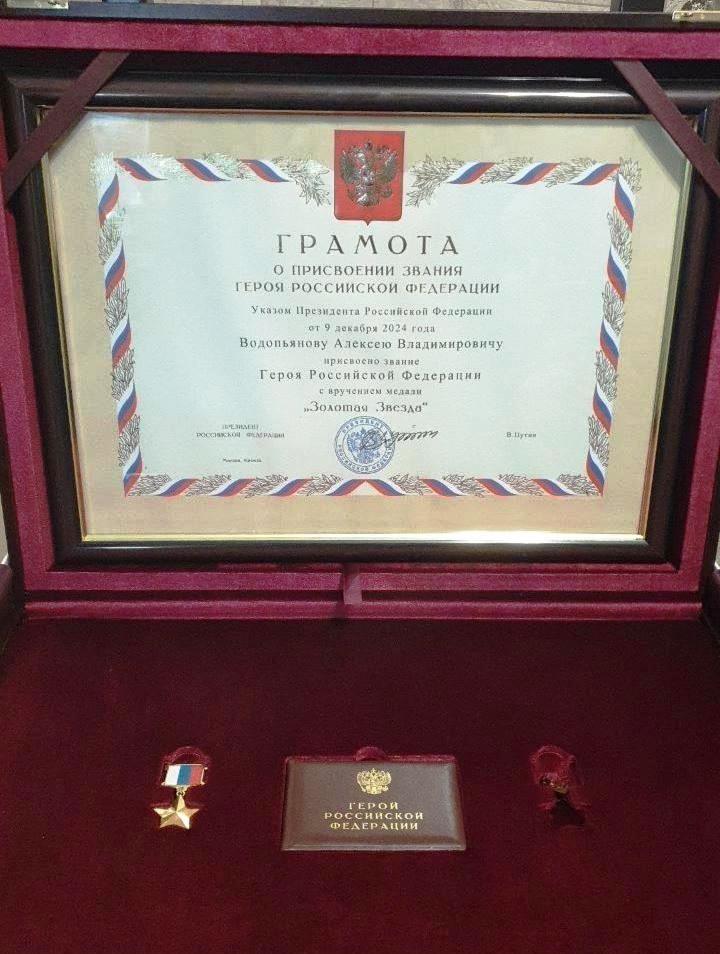 Указом Президента Российской Федерации («закрытым») от 9 декабря 2024 года за мужество и героизм, проявленные при исполнении воинского долга, гвардии майору Водопьянову Алексею Владимировичу присвоено звание Героя Российской Федерации с вручением знака особого отличия – медали «Золотая Звезда». Продолжает служить в своей части. Гвардии майор. Награждён орденом Мужества, медалью ордена «За заслуги перед Отечеством» 2-й степени с мечами, 2 медалями «За отвагу», другими медалями.