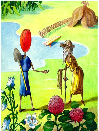 И, действительно, только сейчас Тюльпан Младший заметил, как неуютен берег пруда. Посторонние предметы мешали старому мастеру вымачивать волокна льна. Вдвоём они довольно быстро очистили берег. Благодарный дедушка Лён выбрал самую крепкую верёвку и протянул её Тюльпану. Поклонившись мастеру, цветок поспешил к Ручью.