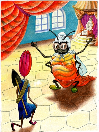Внезапно стражник подбежал к колбе и сбросил её. Ударившись о каменный пол, она со звоном разлетелась на мелкие сверкающие осколки. На глазах у удивленного Тюльпана Трутень-воин превратился в молоденькую Пчёлку-труженицу. Верёвка колечками лежала на осколках колбы. Пчёлка произнесла: