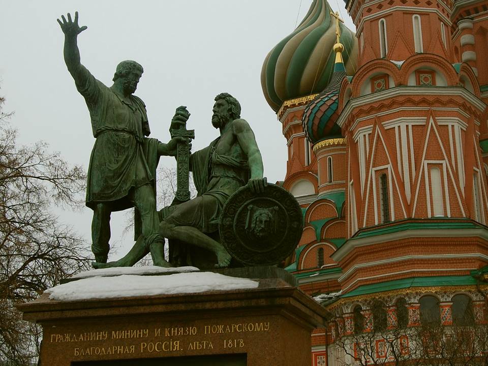 Памятник Минину и Пожарскому на Красной площади, уменьшенная копия в Нижнем Новгороде. Памятник на Красной площади вопросов не вызывает, раз так сделали, значит так и надо, рядом Лобное место, на котором Пётр I рубил головы стрельцам. История подсказывает голове, которая пока на плечах, спорить не стоит. Совсем другое дело в Нижнем Новгороде, это всего лишь памятник, можно высказать и своё мнение. Минин и Пожарский в античной одежде, у нас такая одежда называется исподняя рубашка. Они босиком, но босиком у нас не походишь, ополчение из Ярославля в Москву шло целый год.
