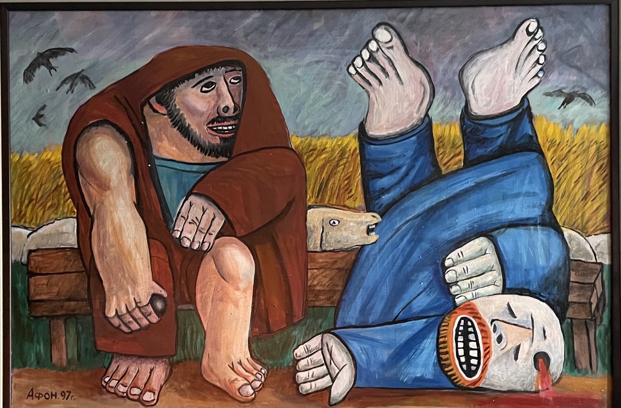 Хозяином квартиры, куда меня пригласили, был Андрей Вышегородцев. Квартирная выставка оказалась домашней галереей, а точнее – магазином живописи на дому. Трехкомнатная квартира завешена от пола до потолка; полотна без рам, предоставлены друзьями хозяина – художниками неформалами. Посетителей – никого. Пока Вышегородцев с Афоничевым пили на кухне водку, я неторопливо обошел комнаты, осмотрел экспозицию. Среди представленного оказалось много работ Владислава Федоровича. Манера письма яркая, запоминающаяся, цвета контрастные, сочные, полотна большие, сюжеты в основном библейские, да и подпись «Афон» – ни с кем не спутаешь. Немного пугал нарочитый натурализм: оторванные руки, отрезанные головы, кровь, а в целом вполне приличная живопись. Одна из картин понравилась: Каин и Авель – первое убийство. Вернувшись на кухню, я спросил Афоничева: