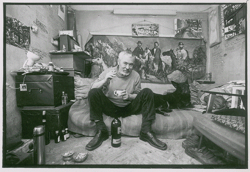 Мастерская Владимира Яшке была небольшой, с низким потолком. Два крохотных оконца, стеллажи с рулонами бумаг и скрученными холстами. Стол, сделанный из тумбочки. И много-много картин. Сваленные на полу, прислоненные к стене, они занимали все пространство мастерской, так что на грязном полу оставалась лишь узкая дорожка для прохода от двери до кровати.