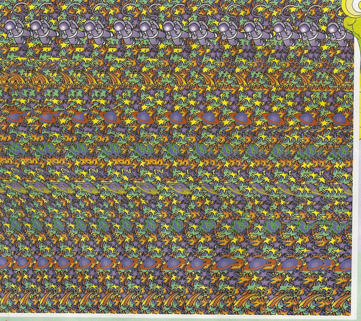 Под воздействием луча света закодированные на плоскости непонятные крючочки и загогулинки под названием «информационный паттерн» внезапно превращаются в понятное, реалистическое, объёмное изображение. Да будет свет! (Если вы внимательно присмотритесь к стереограмме на иллюстрации, то вы тоже внезапно увидите некое объёмное космическое изображение.) Вот этот «информационный паттерн» в виде абсолютно бессмысленных для человеческого сознания крючочков и загогулинок и есть «свёрнутый», или «скрытый» порядок, в котором всё и содержится на некоем ином, недоступном человеческом восприятию уровне реальности. (Да, не зря братья-буддисты утверждают: «Всё реальное — неописываемо, всё описываемое — нереально».)