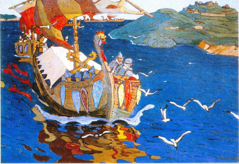 "Плывут полуночные гости. Светлой полосой тянется пологий берег Финского залива. Вода точно напиталась синевой ясного весеннего неба; ветер рябит по ней, сгоняя матово-лиловатые полосы и круги. Стайка чаек опустилась на волны, беспечно на них закачалась и лишь под самым килем передней ладьи сверкнула крыльями — всполошило их мирную жизнь что-то малознакомое, невиданное. Новая струя пробивается по стоячей воде, бежит она в вековую славянскую жизнь, пройдет через леса и болота, перекатится широким полем, подымит роды славянские — увидят они редких, незнакомых гостей, подивуются они на их строго боевой, на их заморский обычай. Длинным рядом идут ладьи! Яркая раскраска горит на Солнце. Лихо завернулись носовые борта, завершившись высоким, стройным носом".