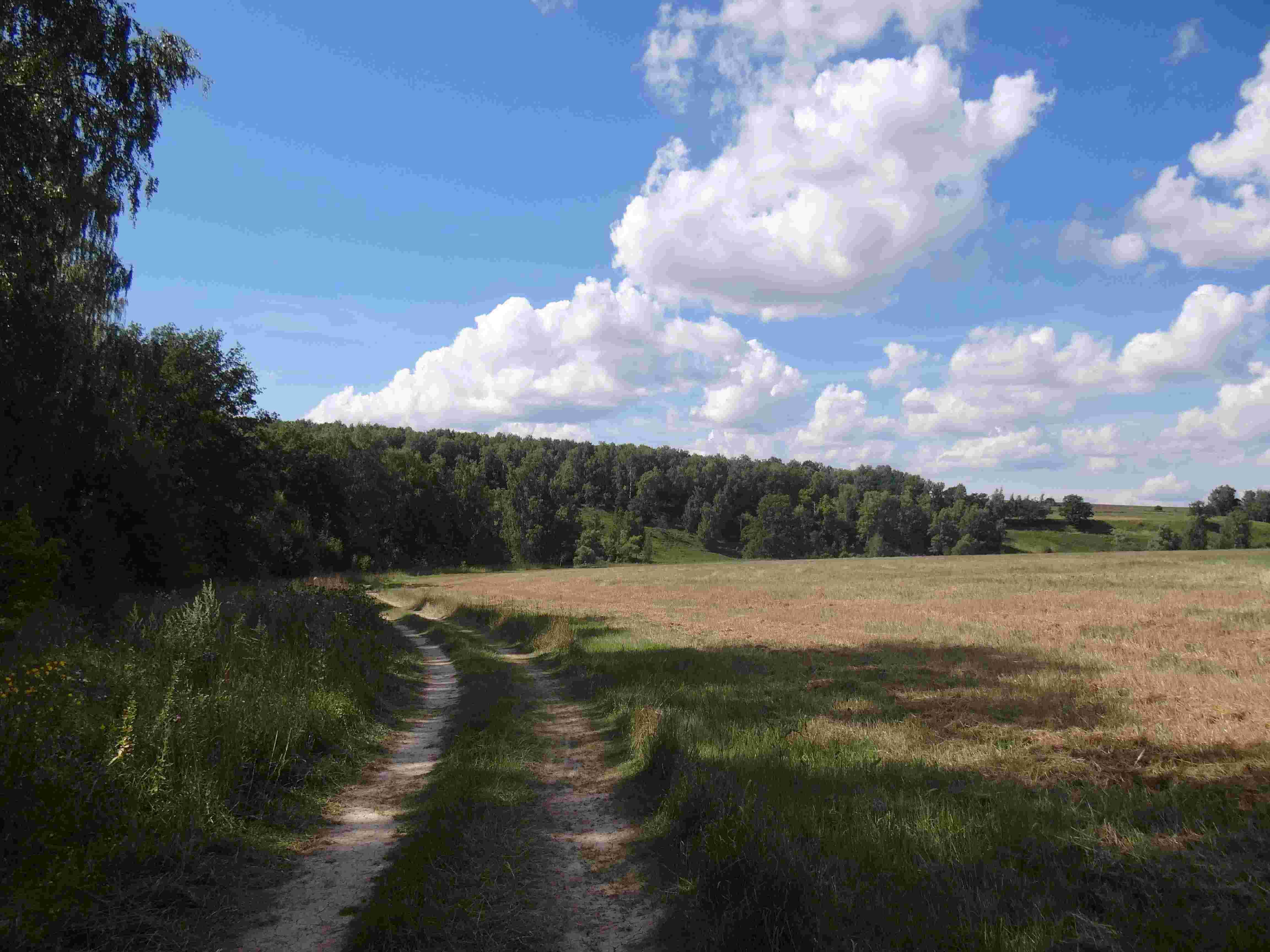 Две плотно накатанные грузовиками колеи ведут его мимо раскинувшегося слева желтого ржаного поля с синими васильками вдоль обочины. За огромным – в полмира – полем – панорамный вид на необъятное пространство с обласканными солнцем далёкими полями и лесами – до самого далёкого горизонта. Справа – берёзовая роща, хранящая свежесть и прохладу среди белых стволов. Тень падает на половину дороги, по которой и мчится вприпрыжку Шурик.