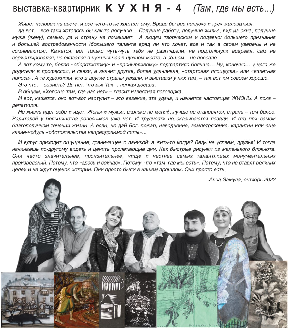 Вчера открывшаяся площадка "КУХНЯ -- 4" -- классический выставочный квартирник, как в самом начале 1970-х: явки, пароли и адреса не оглашались, только свои, никаких чужих; я, словно б, окунулся в Советскую власть, -- молод и свеж, и хорошо, -- в атмосферу 50-и лет назад!
