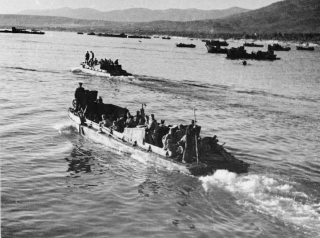 Десантные катера вышли с задержкой. На войне всегда случаются какие-то непредвиденные обстоятельства. В 02.44 за 16 минут до высадки началась совместная артподготовка орудий 18-й армии, береговых батарей и нанесение ударов флотскими бомбардировщиками.