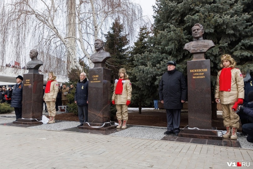 Сегодня, 1 февраля 2023 года, в Волгограде возле музея-панорамы «Сталинградская битва» открыли памятник генералиссимусу Иосифу Сталину, а также еще двум советским маршалам — Георгию Жукову и Александру Василевскому.