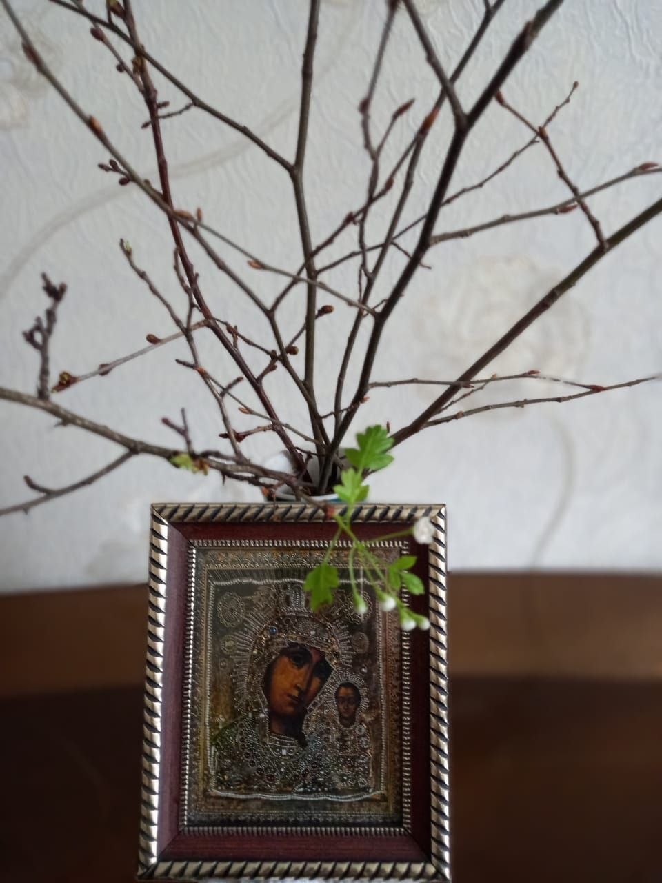 15 февраля 2023 года на праздник Сретение Господне в вазе, без воды зацвела сухая ветвь. На ветви появились почки, листочки и цветочки.