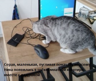 Серая, маленькая, пугливая поначалу ко всему Ника появилась в трёхкомнатной квартире вместе с дедушкой, которого забрали для ухода – сам себя обслуживать он уже не мог. Кошка почти не отходила от хозяина, «лечила» его – спала с дедушкой рядом, лежала на ногах и на груди.